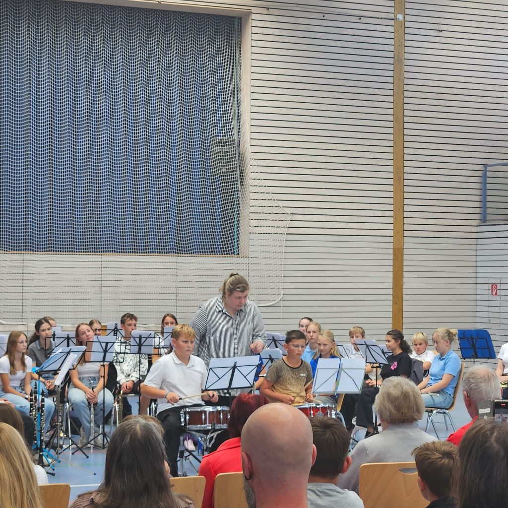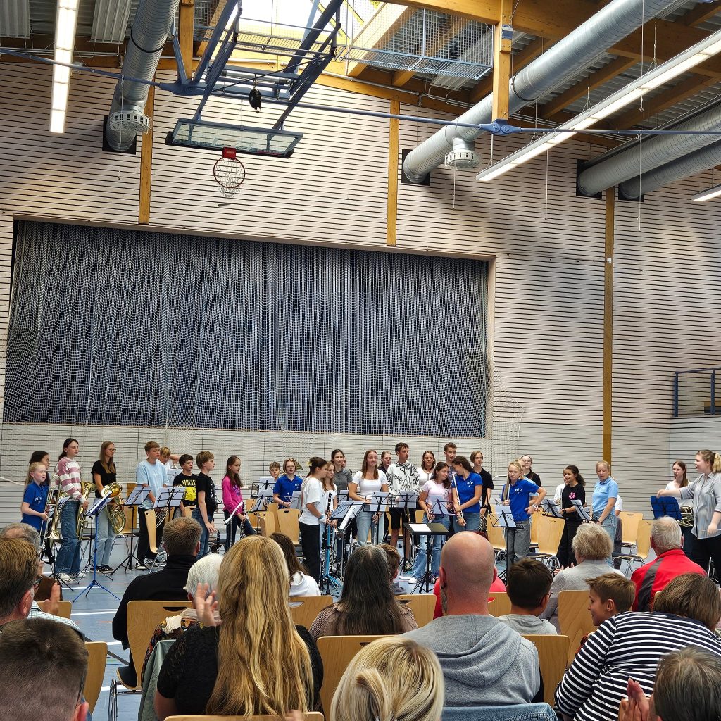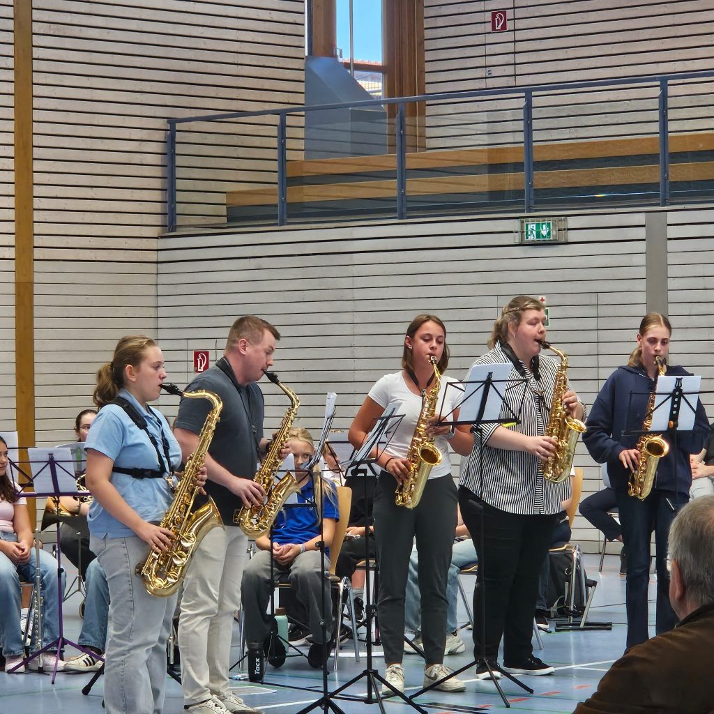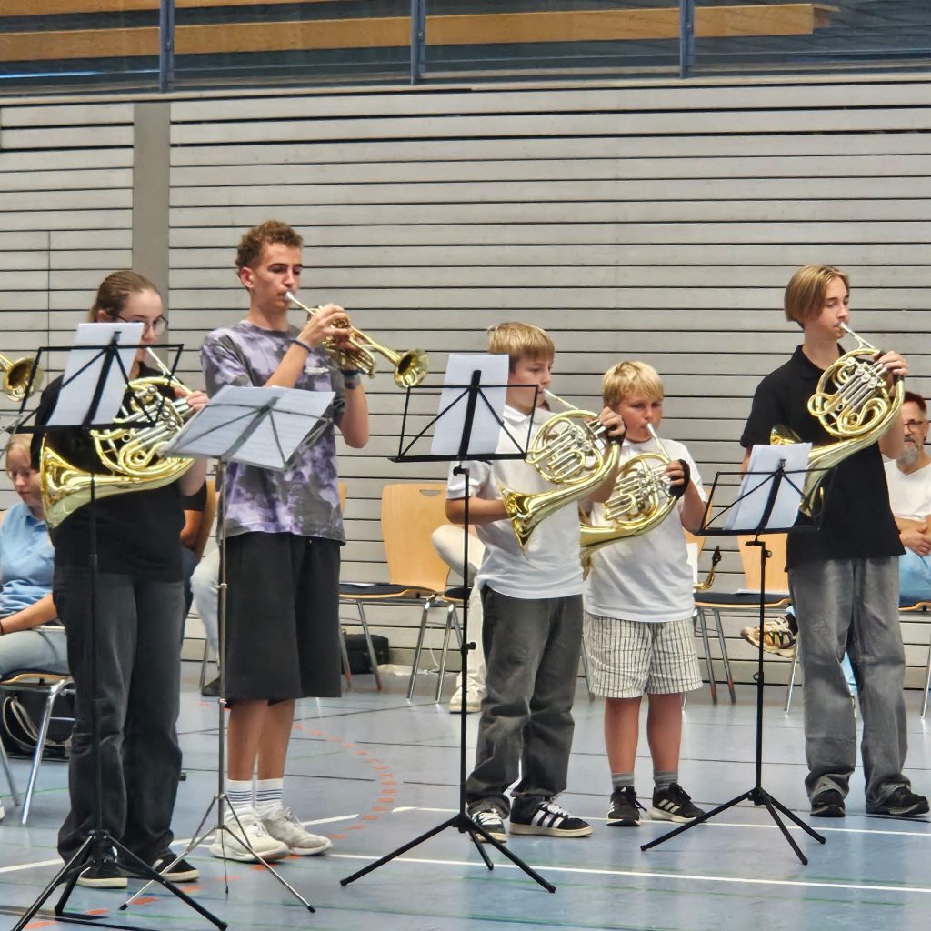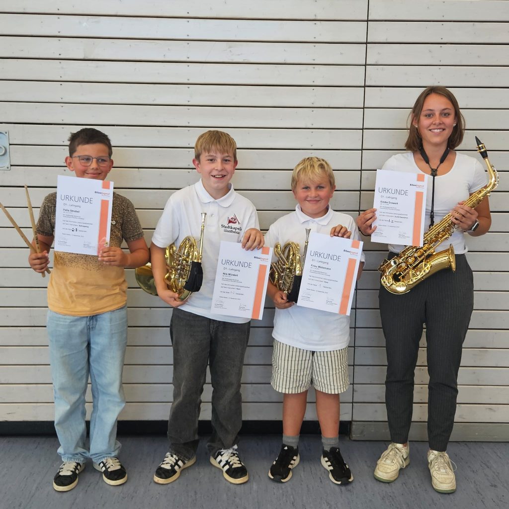 Unsere vier Teilnehmer Emilie Drawert (Saxophon), Friso Weismann (Waldhorn), Nils Mürdter (Waldhorn) und Felix Strobel (Schlagwerk) konnten den Lehrgang mit tollen Ergebnissen abschließen.