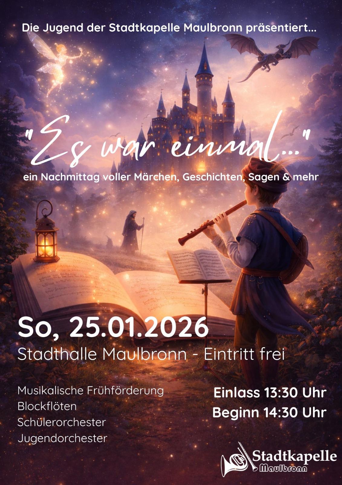 Das Konzert findet am Sonntag, den 25. Januar, in der Stadthalle Maulbronn statt. Beginn ist um 14:30 Uhr (Einlass um 13:30 Uhr), der Eintritt ist frei. Es erwartet Sie ein abwechslungsreiches Programm, gestaltet von den Musikerinnen und Musikern unserer gesamten Jugend.